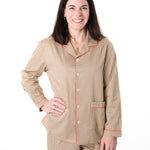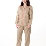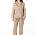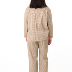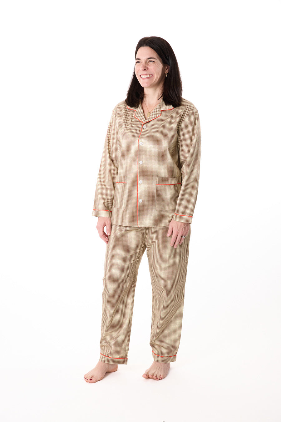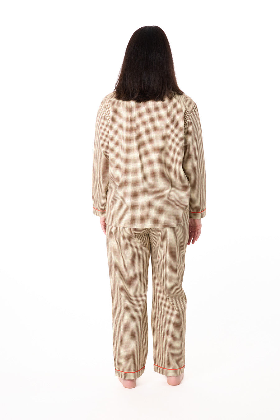 Classic meets comfort in the Houndstooth — a vintage-inspired pajama set designed to flatter. With its signature brown-and-cream pattern, red piping, and tailored cropped flare pant, this set blends sophistication and ease for the modern bedtime routine.