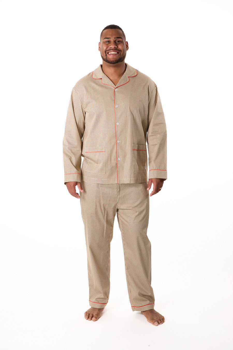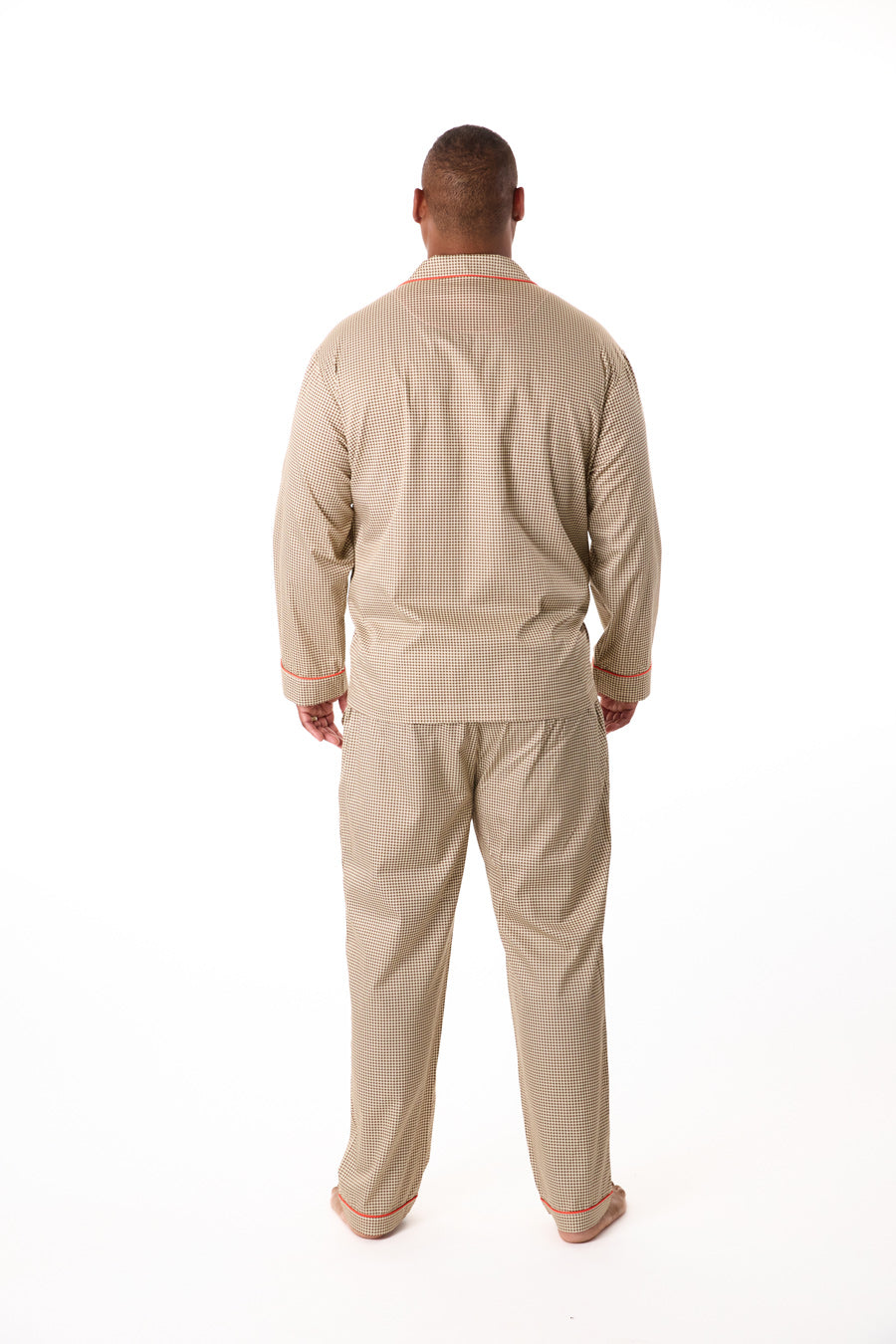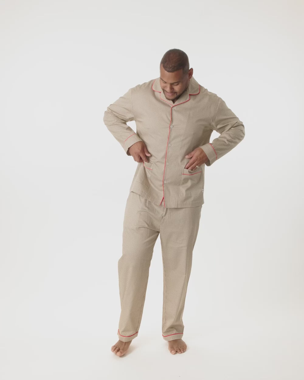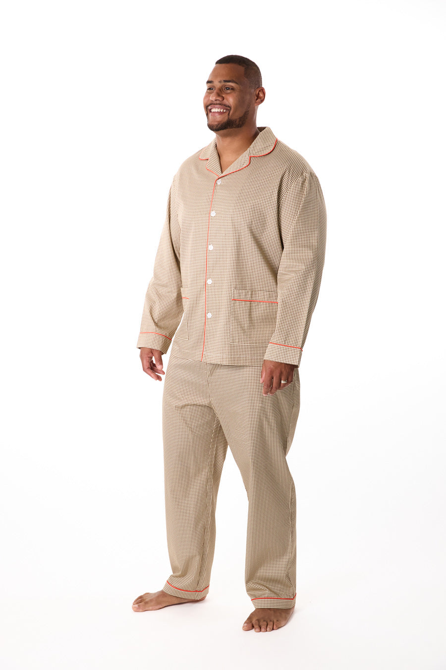 - Patterned for Refinement: Featuring a refined houndstooth print trimmed in bold red piping, this pajama set reimagines a menswear classic for leisure hours. The look is timeless, tailored, and designed to carry you seamlessly from evening reading to slow Sunday mornings.