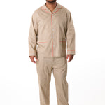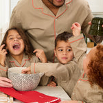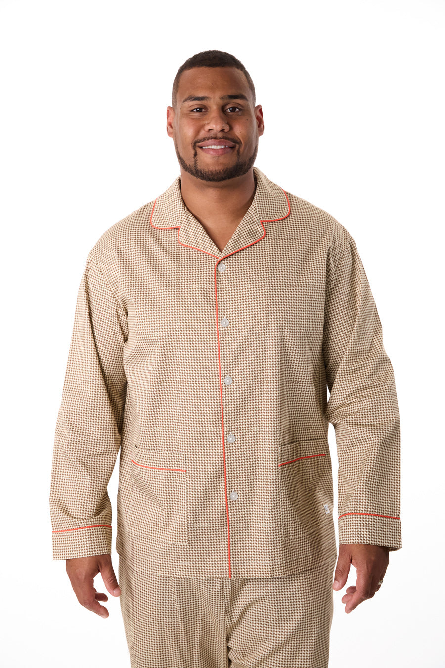 Classic meets comfort in the Houndstooth — a standout pajama set that pairs vintage-inspired tailoring with modern ease. With its iconic brown-and-cream pattern, crisp red piping, and traditional straight-leg silhouette, this set brings quiet sophistication to your nighttime routine.